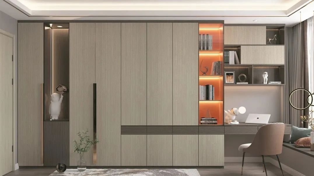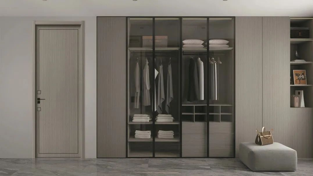 温厚敦实的木纹砖承接地面与墙面的连接,奠定了卧室沉稳宁静的基调,搭配象牙白护墙板,清雅舒适,浓淡相宜,层次逐级拉开,呈现出简而不凡的效果,给居者一个宁静居所。木寓意质朴、朴素,返璞归真之意,木质的沉淀,由空间内四散开来,以亲密性拉近空间与人的关系。